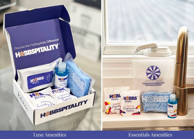 We're thrilled to provide our Hobbspitality Essentials and Hobbspitality Luxe guest amenity gifts, a testament to our commitment to setting new standards in guest satisfaction. Each starter kit, professionally packaged and individually wrapped, is designed to enrich your stay, ensuring it's not just a vacation, but a retreat into luxury and comfort. Find out which is provided with your rental choice on the property's detail page and start dreaming of a vacation where every detail is taken care of.